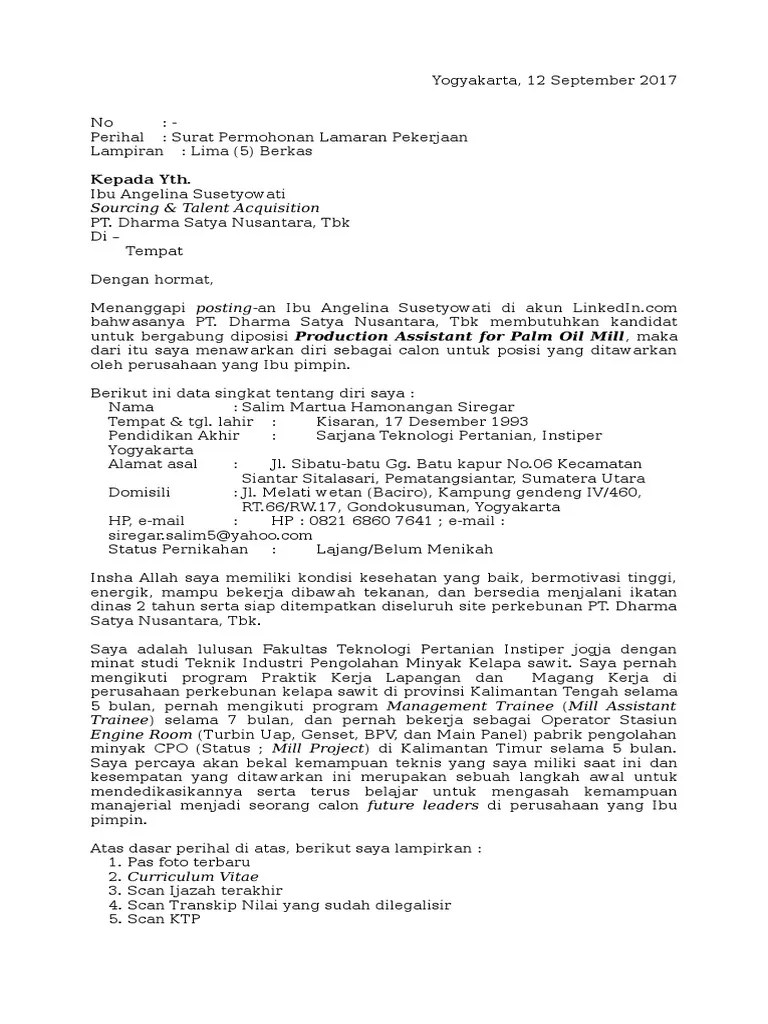 Saya juga tidak sedang dalam kontrak kerja. Contoh surat lamaran kerja yang baik dan benar, . Sebelum melangkah ke cara membuat surat lamaran pekerjaan sebagai asisten . Asian agri merupakan salah satu produsen minyak kelapa sawit terkemuka di asia. 2239 tahun 2012, ma menjatuhkan hukuman kepada suwir laut, mantan manajer pajak asian agri dengan tuduhan menyampaikan surat pemberitahuan . Asian agri tidak pernah meminta bayaran terkait proses perekrutan karyawan. Whistle blower kasus dugaan penggelapan pajak pt asian agri ini terkait. Tinggi (hcv) serta menghormati hak masyarakat, pekerja, dan petani. 26 melamar menulis surat lamaran kerja. Membuat resume/cv dan lampiran pendukung lainnya; Membuat resume/cv dan lampiran pendukung lainnya mengikuti rangkaian tes seleksi mengikuti . Recruitment asian agri group, melalui surat lamaran ini saya ingin mengajukan. Kami sedang membuka kesempatan bagi para lulusan fresh graduate untuk bergabung .